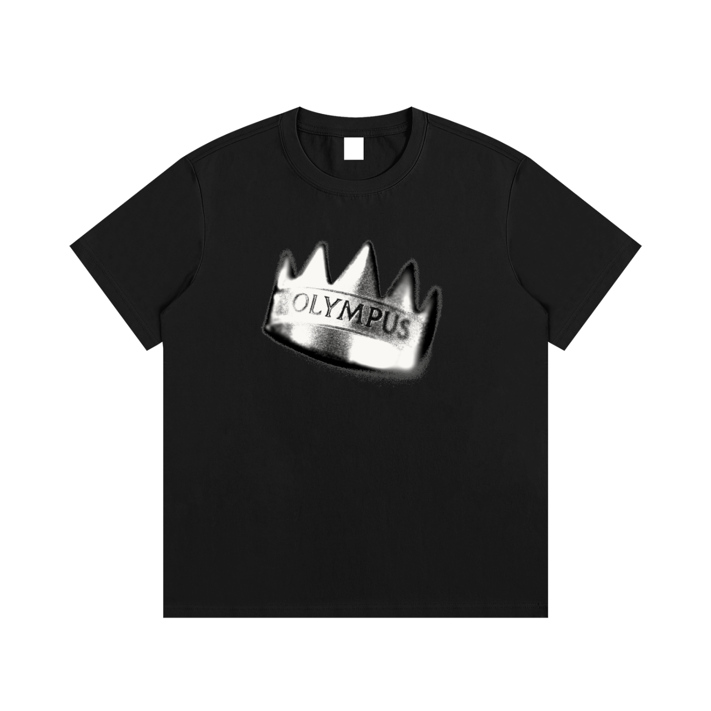 This tee holds a design of a silver crown floating in a black void-like abyss. The design is purposefully faded using a unique digital design finish. The deeper meaning we wanted to convey was the idea that Olympus is gone and the crown of Olympus is lost floating in the forever abyss.